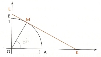 (O,OA,OB) est un repère orthonormal du plan. M est un point du quart de cercle de centre O de rayon 1. La tangente à M au quart de cercle coupe l'axe des abscisses en K et l'axe des ordonnées en L.