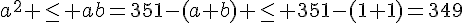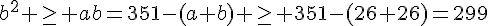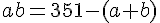 Deux nombres a et b sont pris dans l’ensemble {1 ; 2 ; 3 ; ... ; 25 ; 26}. Le produit ab est égal à la somme des 24 nombres restants. Quelle est la valeur de |a – b| ?
