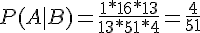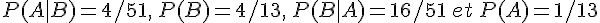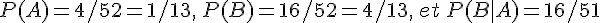 Ensuite, la proba conditionnelle, ça se complique. Je nomme A="Tirer un as" et B="Tirer un 10/V/D/R".
