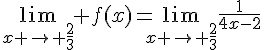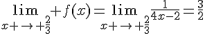 Il faut que tu envisages la limite de la fonction en 2/3 lorsque x <= 2/3 et dans ce cas le dénominateur de la fonction ne vaut pas 4x-2
