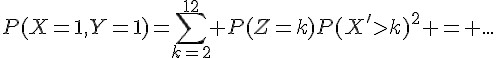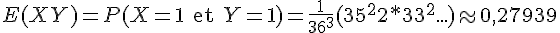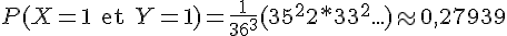 Je sais que je dois faire quelque chose comme (Probabilité que J1 fasse un certain nombre * Probabilité que J2 fasse un certain nombre * Probabillité de gagner (faire mieux que la banque) ) / 36^3, mais il y a tellement de cas que je m'embrouille et je n'arrive pas à trouver de règle pour simplifier...