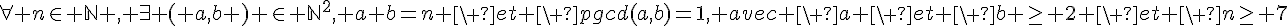 J'ai réussi cet exercice et ai essayé de généraliser, pour tout entier naturel n>2, il existe au moins un couple (a,b) d'entiers naturels >1 tels que a+b=n et a^b=1.