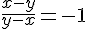 je cherche à simplifier la formule suivante : ((1/y)-(1/x))/(y-x), le résultat devrait être : -1/(x*y). Après avoir mis les deux fractions isolées du haut sous le même dénominateur (y*x) puis avoir mis l'équation du bas (y-x) sous forme de quotient (y-x)/1, j'en arrive à cette situation dont je n'arrive pas à trouver de manipulations qui me mèneraient à la solution indiquée plus haut :