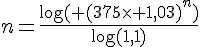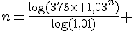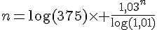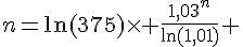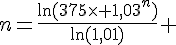 je cale sur n= log375*(1,03)exposant n / log 1,01