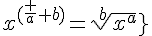 je veux dire x puissance (a/b) comment ça se calcule? j'ai voulu faire plus long chemin en faisant, x puissance a puissance 1/b donc x puissance a puissance b lui même puissance -1 mais là j'arrive plus à simplifier quoi que ce soit...un nombre puissance un nombre lui même puissance quelque chose je n'ai jamais vu ça...