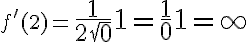 Je te conseillerais de tout mettre au même dénominateur pour écrire f'(x) sous la forme d'une fraction, puis d'écrire quelque chose comme : quand x tend vers 2+, le dénominateur de f'(x) tend vers 0+ tandis que le numérateur tend vers 1 ; f'(x) tend donc vers +00. La limite de f(x) - f(2) / (x - 2) quand x tend vers 2+ est donc +00.