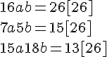 Les résultats que j'ai donné pour a et b sont des congruences modulo 26.