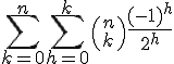 Le coefficient binomial ne dépend pas de h donc peut être sorti de la remière somme. Tu devrais alors reconnaitre la somme d'une série géométrique de raison q=...