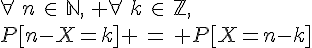 Bonjour, J'ai une petite question. Connaissant la loi P(X=k) d'une va discrete X, comment calculer la loi de n-X ? De meme quand on connait deux lois de probas pour deux va X et Y, comment faiton pour calculer la loi de X+Y ? Merci d'avance