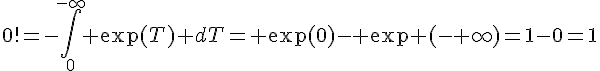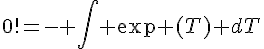 0! = - inté de exp T dT sur 0 , -oo = exp ( 0 ) - exp ( -oo ) = 1 - 0 = 1