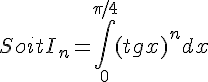 Je n'ai pas sût répondre à la dernière sous question cependant. Quelqu'un aurait-il une idée pour la démonstration ?Code:calculez i. I_0, ii. I_1, iii. I_2 et iv. Demontrer que la fonction I_n évolue monotonément en fonction de la croissance de n. Ce qui revient à dire que