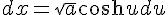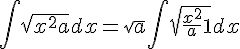 j'ai bien vu le début en passant par un changement de variable u=x/(racine(a)) puis par u=sh(t). j'arrive à int((ch2t)^(1/2)chtdt)
