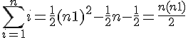 Je désire savoir comment on peut montrer que la somme sum(i,i=1..n) est égal à 1/2*(n+1)^2-1/2*n-1/2 ? ET comment faire par exemple pour un autre cas ( bref la généralisation). ?