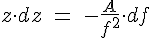 Nous avions posé que df/dt=z, soit df/dz*dz/dt=z. Sachant que df/dz=-A/z3, on a: