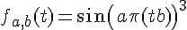Voila, je suis face à un problème mathématique, et je dois expliciter une fonction qui répondrait à certains critères : ce que je voudrais savoir, c'est comment est-ce qu'il est possible de contracter une fonction. Je pars d'une fonction sinusoïdale en forme de cloche, et j'aimerais réduire la largeur de cette cloche. Ma fonction est f(t)=sin(Pi*t)^3. Nous remarquons que f(0)=f(1)=0.