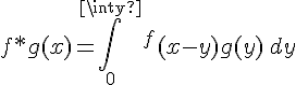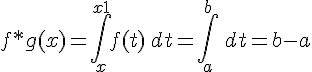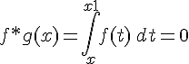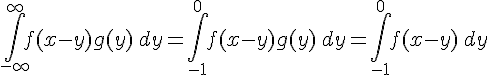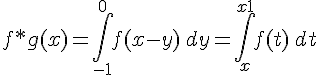 h(x)= intégrale (-infini à + infini) f(x-y) g(y) dy = intégrale (-1 à 0) f(x-y)dy = intégrale (x à x+1) f(t)dt