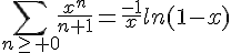 On intègre et on obtient -ln(1-x). Pour avoir la somme on divise par x :