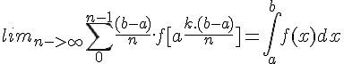 La somme de Riemann correspond en fait à la somme des aires de petits rectangles de largeur un pas qui vaut p=(b-a)/n où on fera tendre n vers l'infini et de hauteur la valeur de ta fonction au point k, c'est à dire f(a+k*p)=f(a+k.(b-a)/n) et qui recouvre la surface entre ta courbe et l'axe des abscisses. C'est pour ca que tu as le terme (b-a).f[a+k.(b-a)/n]/n dans ta somme.