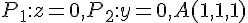 dans un espace de dimension 3, muni d'un repère orthonormé. Les deux plans sont donnés par des équations implicites et A par ses coordonnées, on note D la droite intersection de P1 et P2. On considère les cas suivants: (il y a 6 cas, je ne vous en montrerai qu'un)