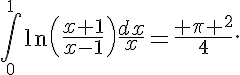 Voila, je suis face à une intégrale que je n'arrive pas à calculer. Il s'agit d'intégrer la fonction ln((1+x)/(1-x))/x par rapport à x entre 0 et 1. J'ai essayé plusieurs méthodes et j'ai l'impression que le calcul de cette intégrale doit être mené en utilisant le théorème des résidus de Cauchy et le lemme des petites et grandes encoches. Mais la singularité en 0 est très gênante. Si quelqu'un pouvait m'aider, ce serait sympa.