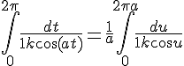 int {0->2Pi} { dt/(1+ k.cos at) }