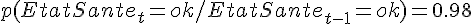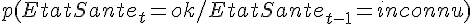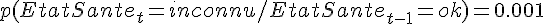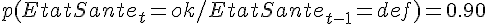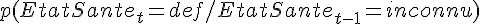 Mon problème: on cherche à modéliser grâce à des réseaux bayésiens le passage d'un état de santé à un autre. Un exemple très simple: un composant avec un seul défaut connu=> on a donc trois états de santé {ok, déf, inconnu}. On suppose que le défaut déf est plutôt temporaire, on aura donc des probas dans ce style: