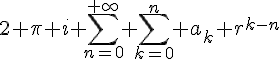 Tu ecris des choses très bizard dans ton dernier post, ton avant dernière lignes n'a aucun sens à priori : l'idée c'est que tu as une somme d'intégrale dont tout les termes vont être nul (car intégrale de exp(kix) entre 0 et 2pi) sauf un, et c'est ce terme là qu'on doit calculer. là je sais pas d'ou tu sort une somme sur k de 0 à l'infini de Ck que tu remplace par la somme de k=0 à n de ak : ca n'as aucun sens :S