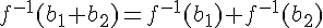 si x est dans f^(-1)(a)+f(-1)(b), alors x s'ecrit a'+b' (notation evidente) et f(x)=f(a')+f(b')=a+b : x appartiens à f^(-1)(a+b)