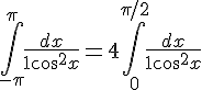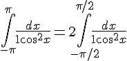 Entre Pi et -Pi:1/(1+cos2(x)) (en fait j'ai fait un changement de variable en tan mais a-t-on le droit car cela n'est pas bijectif??? Au final j'ai toruvé comme primitive 1/sqrt(2)*ln(tan(x)/sqrt(2))).