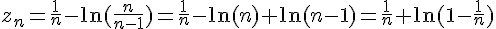 La série de terme générale zn= 1/n - ln(n/n-1) diverge elle où converge-t-elle?J'ai trouvé qu'elle divergeait (1/n série harmonique diverge et l'autre converge mais je n'ai pas réussi à le prouver donc la somme des 2 diverge).