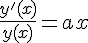 le cheminement que j'ai fait (pas forcément le meilleurs) Y'/Y on peut visiblement trouver un lien avec la fonction Ln en effet une primitive de Y'/Y est Ln(Y) + B avec B réel constant. de même ax a pour primitive (a/2)x² + C avec C réel constant. Ln(Y) + B = (a/2)x² + C posons K contant tel que K=C-B, Ln(Y) = (a/2)x² + K avec K = Ln(Y(0)) Y(x)= e ( [a/2]x² + Ln[Y(0)] ) on va quand même vérifier ^^ : Y'(x)=e ( [a/2]x² + Ln[Y(0)] ) * ax Y'(x)/Y(x)=ax donc tout va bien ^^ si je me suis trompé, merci de bien vouloir vite me corriger ^^