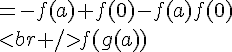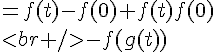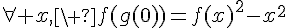Comment montres tu que f(0)=0 ?Cliquez pour afficherPour y=0, on obtient f(g(x))=(1+f(0))f(x)-f(0), donc insérant cette expression dans l'équation initiale et en posant y=x : f(x)²-x²=f(0)². On montre ensuite que nécessairement f(0)=0, donc |f(x)|=|x|, puis il ne reste plus qu'à faire une distinction des différents cas.