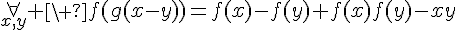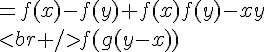 Cliquez pour afficherPour y=0, on obtient f(g(x))=(1+f(0))f(x)-f(0), donc insérant cette expression dans l'équation initiale et en posant y=x : f(x)²-x²=f(0)². On montre ensuite que nécessairement f(0)=0, donc |f(x)|=|x|, puis il ne reste plus qu'à faire une distinction des différents cas.