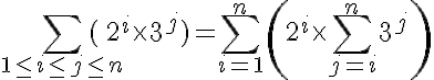 et j'obtiens : somme de 1<=i<=n de somme de 1<=j<=i de 2^i x 3^j