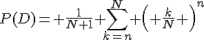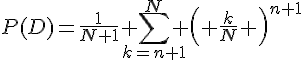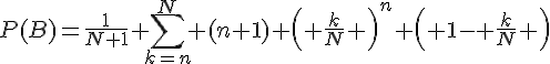 J'aimerais savoir si ma solution pour un exercice de probabilités est correcte : on considère N+1 urnes, numérotées de 0 à N ; dans la k-ième urne, il y a k boules blanches et N-k boules rouges ; on choisit au hasard une de ces urnes, puis on effectue n+1 tirages avec remise. On cherche à connaître la probabilité que la (n+1)-ième boule tirée soit blanche, sachant que l'on a déjà tiré n boules blanches.