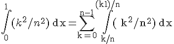 Or je ne comprends pas comment pouvons nous ecrire cela? En effet pour les bornes de l'intégrale je comprends, car on utilise la relation de Chasles, mais pour la somme de ce qu'il y a à l'intérieur de l'intégrale je ne vois pas comment fait - on, car le "k" à l'intérieur de l'intégrale dépend aussi du k de la somme, or d'apres la relation de Chasles, lorsqu'on applique cette relation, on ne peut pas changer ce qu'il y a à l'intérieur de l'intégrale. Or la on se fixe un k qui est dans l'intégrale, et ensuite on le fait varier en appliquant la relation de Chasles. Je ne sais pas si vous m'avez compris, mais j'espere que vous saurez répondre à ma question.