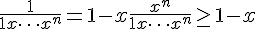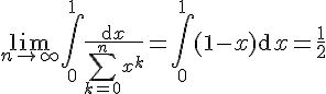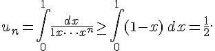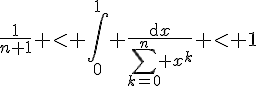 Voila je dois déterminer la nature de la série numérique Un ou Un est l'intégrale de 0 à 1 de dx/(1+x+x²+...+x^n) à part remarquer que l'on peut utiliser la formule d'une somme d'une suite géométrique de premier terme U0=1 et de raison x je ne vois quoi dire d'autres. Merci encore![]()