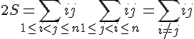 <math xmlns='http://www.w3.org/1998/Math/MathML'><mrow><munderover><mo> ∑</mo><mrow><mi>j</mi><mo>=</mo><mn>2</mn></mrow><mi mathcolor='#c800c8'>n</mi></munderover><munderover><mo>&Su m;</mo><mrow><mi mathcolor='#c800c8'>i</mi><mo>=</mo><mn>1</mn></mrow><mrow><mi mathcolor='#c800c8'>n</mi><mo>−</mo><mn>1</mn></mrow></munderover><mi>i</mi><mo>⋅</mo><mi>j</mi></mrow></math>