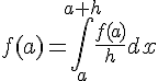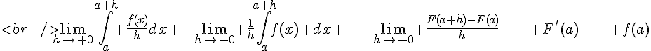 on suppose que f intégrable sur [a,a+h] on note F sa primitive on a donc: lim int(f(x)/h)=lim 1/h[F(a+h)-F(h)] =F'(a) =f(a)