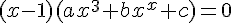 Tu remarques que 1 est une solution évidente donc tu peux factoriser ton polynôme,Ensuite, par identification tu trouve a,b,c.