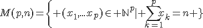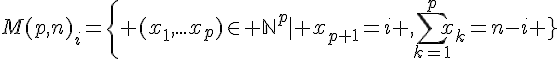 Voilà, je cherche à déterminer le cardinal de l'ensemble suivant, sans succès :où n est un naturel non nul fixé et p un naturel strictement plus petit que lui.