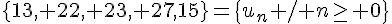 prenant (au moins) une fois chacune des valeurs 13, 22, 23, 27 et 15, i.e. satisfaisant