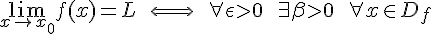 quelque soit epsilon, il existe un béta ou la valeur absolue de x-x0 inférieure à béta implique la valeur absolue de f(x)-L inférieure à epsilon