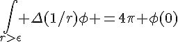 Je trouve alors l'intégrale sur {r>epsilon} de (1/r * delta phi) dV = l'intégrale sur {r=epsilon} de [ (1/r) * ∂ϕ/∂r + ϕ * (1/r^2) ]