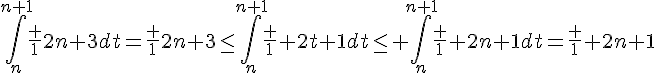 Elle est décroissante sur IR+, et donc on a ce résultat entre [n,n+1]: 1/2(n+1)+1< intégrale entre n et n+1 de 1/(2t+1) < 1/(2n+1)