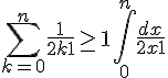 Je n'arrive pas à comprendre ta démarche quand tu dis : "entre [n,n+1]: 1/2(n+1)+1< intégrale entre n et n+1 de 1/(2t+1) < 1/(2n+1)".