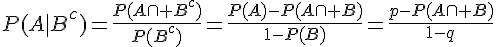 on peut facilement calculer P(A|Bc) en fonction de r (et des constantes p et q). Les conditions sur p et q font que r a un domaine de variation réduit, et la fonction f(r)= P(A|Bc) est décroissante, ce qui permet d'encadrer P(A|Bc).