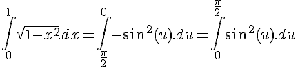 En faisant un changement de variable x = cos(u), on a dx = -sin(u).du et √(1-x²) = √(1-cos²(u)) = |sin(u)|. Pour x variant de 0 à 1, soit u variant de π/2 à 0, on a √(1-x²) = +sin(u). On en revient donc à intégrer :