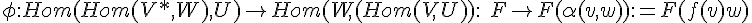Considérons trois espaces vectoriels finidimensionnels V, W et U sur un corps. Je veux démontrer qu'il existe un isomorphisme naturel des espaces vectoriels