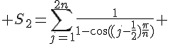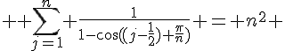 On se rend compte alors que l'on a dans la somme un terme en 1/(1-cos (j-1/2)*pi/n) et un terme 1/(1-cos (n-j-1/2)*pi/n), qui se trouve etre egal a 1/(1+ cos (j-1/2)*pi/n) (les 2 angles sont symétriques par rapport a pi/2).